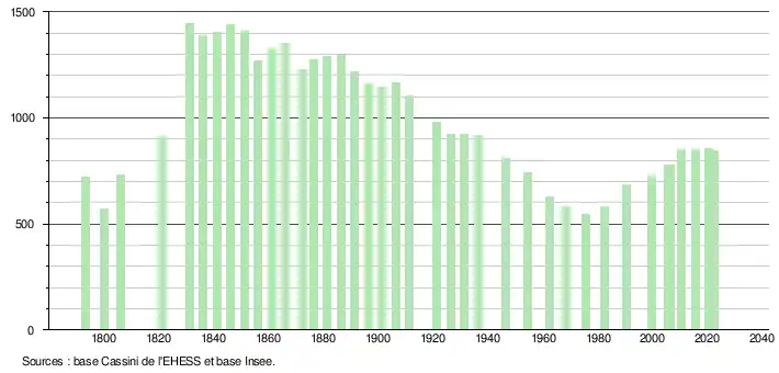 L'évolution du nombre d'habitants est connue à travers les recensements de la population effectués dans la commune depuis 1793. Pour les communes de moins de 10 000 habitants, une enquête de recensement portant sur toute la population est réalisée tous les cinq ans, les populations de référence des années intermédiaires étant quant à elles estimées par interpolation ou extrapolation[15]. Pour la commune, le premier recensement exhaustif entrant dans le cadre du nouveau dispositif a été réalisé en 2005[16].