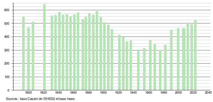 L'évolution du nombre d'habitants est connue à travers les recensements de la population effectués dans la commune depuis 1793. Pour les communes de moins de 10 000 habitants, une enquête de recensement portant sur toute la population est réalisée tous les cinq ans, les populations de référence des années intermédiaires étant quant à elles estimées par interpolation ou extrapolation[19]. Pour la commune, le premier recensement exhaustif entrant dans le cadre du nouveau dispositif a été réalisé en 2007[20].