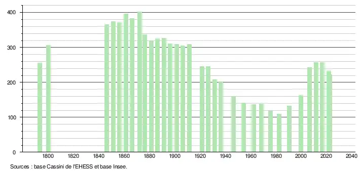 L'évolution du nombre d'habitants est connue à travers les recensements de la population effectués dans la commune depuis 1793. Pour les communes de moins de 10 000 habitants, une enquête de recensement portant sur toute la population est réalisée tous les cinq ans, les populations de référence des années intermédiaires étant quant à elles estimées par interpolation ou extrapolation[39]. Pour la commune, le premier recensement exhaustif entrant dans le cadre du nouveau dispositif a été réalisé en 2006[40].