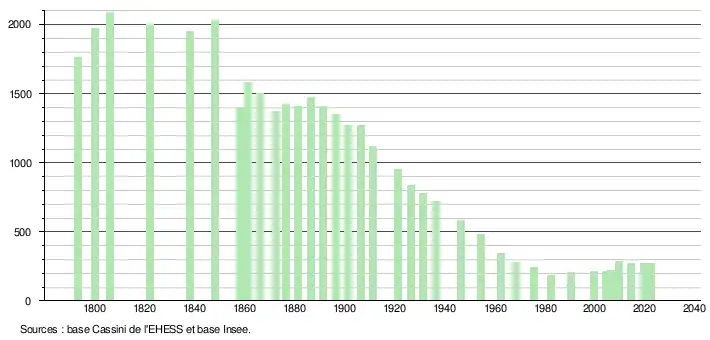 L'évolution du nombre d'habitants est connue à travers les recensements de la population effectués dans la commune depuis 1793. Pour les communes de moins de 10 000 habitants, une enquête de recensement portant sur toute la population est réalisée tous les cinq ans, les populations de référence des années intermédiaires étant quant à elles estimées par interpolation ou extrapolation[15]. Pour la commune, le premier recensement exhaustif entrant dans le cadre du nouveau dispositif a été réalisé en 2004[16].