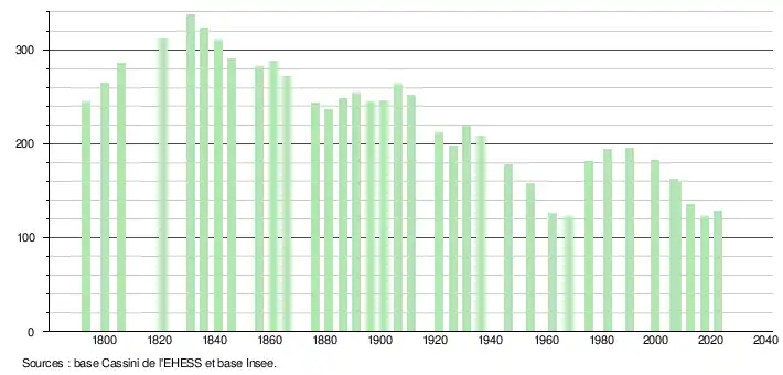 L'évolution du nombre d'habitants est connue à travers les recensements de la population effectués dans la commune depuis 1793. Pour les communes de moins de 10 000 habitants, une enquête de recensement portant sur toute la population est réalisée tous les cinq ans, les populations de référence des années intermédiaires étant quant à elles estimées par interpolation ou extrapolation[30]. Pour la commune, le premier recensement exhaustif entrant dans le cadre du nouveau dispositif a été réalisé en 2007[31].
