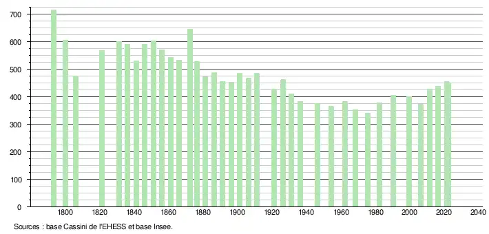 L'évolution du nombre d'habitants est connue à travers les recensements de la population effectués dans la commune depuis 1793. Pour les communes de moins de 10 000 habitants, une enquête de recensement portant sur toute la population est réalisée tous les cinq ans, les populations de référence des années intermédiaires étant quant à elles estimées par interpolation ou extrapolation[28]. Pour la commune, le premier recensement exhaustif entrant dans le cadre du nouveau dispositif a été réalisé en 2006[29].
