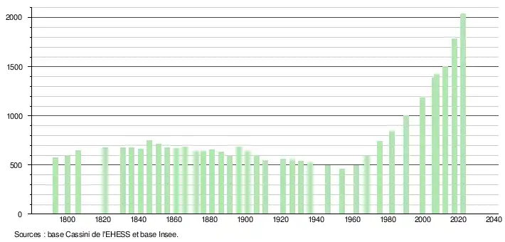 L'évolution du nombre d'habitants est connue à travers les recensements de la population effectués dans la commune depuis 1793. Pour les communes de moins de 10 000 habitants, une enquête de recensement portant sur toute la population est réalisée tous les cinq ans, les populations de référence des années intermédiaires étant quant à elles estimées par interpolation ou extrapolation[16]. Pour la commune, le premier recensement exhaustif entrant dans le cadre du nouveau dispositif a été réalisé en 2007[17].