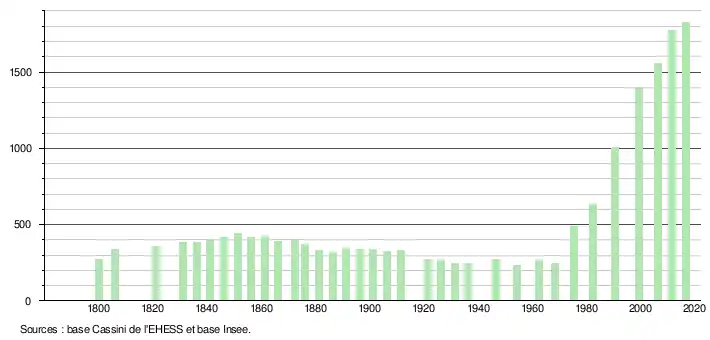 L'évolution du nombre d'habitants est connue à travers les recensements de la population effectués dans la commune depuis 1800. Pour les communes de moins de 10 000 habitants, une enquête de recensement portant sur toute la population est réalisée tous les cinq ans, les populations de référence des années intermédiaires étant quant à elles estimées par interpolation ou extrapolation[12]. Pour la commune, le premier recensement exhaustif entrant dans le cadre du nouveau dispositif a été réalisé en 2006[13].