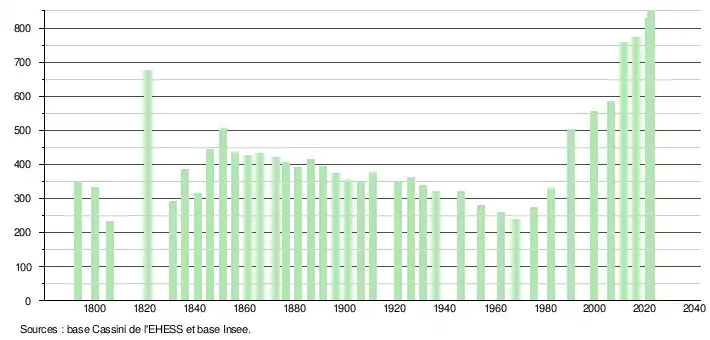 L'évolution du nombre d'habitants est connue à travers les recensements de la population effectués dans la commune depuis 1793. Pour les communes de moins de 10 000 habitants, une enquête de recensement portant sur toute la population est réalisée tous les cinq ans, les populations de référence des années intermédiaires étant quant à elles estimées par interpolation ou extrapolation[15]. Pour la commune, le premier recensement exhaustif entrant dans le cadre du nouveau dispositif a été réalisé en 2006[16].