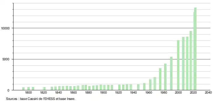 - ↑ Par convention dans Wikipédia, le principe a été retenu de n’afficher dans le tableau des recensements et le graphique, pour les populations de référence postérieures à 1999, que les populations correspondant à une enquête exhaustive de recensement pour les communes de moins de 10 000 habitants, et que les populations des années 2006, 2011, 2016, etc. pour les communes de plus de 10 000 habitants, ainsi que la dernière population de référence publiée par l’Insee pour l'ensemble des communes.