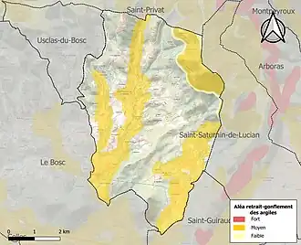 Le retrait-gonflement des sols argileux est susceptible d'engendrer des dommages importants aux bâtiments en cas d’alternance de périodes de sécheresse et de pluie. 40,3 % de la superficie communale est en aléa moyen ou fort (59,3 % au niveau départemental et 48,5 % au niveau national). Sur les 338 bâtiments dénombrés sur la commune en 2019, 265 sont en aléa moyen ou fort, soit 78 %, à comparer aux 85 % au niveau départemental et 54 % au niveau national. Une cartographie de l'exposition du territoire national au retrait gonflement des sols argileux est disponible sur le site du BRGM[17],[Carte 2].