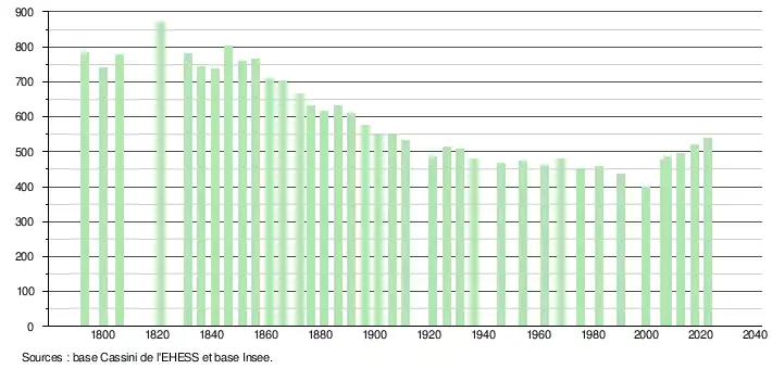 L'évolution du nombre d'habitants est connue à travers les recensements de la population effectués dans la commune depuis 1793. Pour les communes de moins de 10 000 habitants, une enquête de recensement portant sur toute la population est réalisée tous les cinq ans, les populations de référence des années intermédiaires étant quant à elles estimées par interpolation ou extrapolation[33]. Pour la commune, le premier recensement exhaustif entrant dans le cadre du nouveau dispositif a été réalisé en 2007[34].