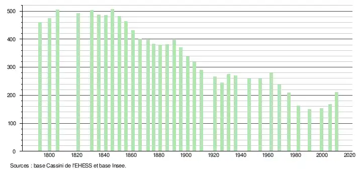 - ↑ Par convention dans Wikipédia, le principe a été retenu de n’afficher dans le tableau des recensements et le graphique, pour les populations légales postérieures à 1999, que les populations correspondant à une enquête exhaustive de recensement pour les communes de moins de 10 000 habitants, et que les populations des années 2006, 2011, 2016, etc. pour les communes de plus de 10 000 habitants, ainsi que la dernière population légale publiée par l’Insee pour l'ensemble des communes.