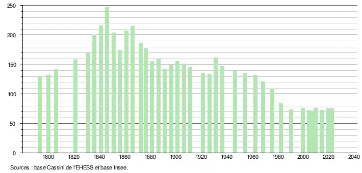 L'évolution du nombre d'habitants est connue à travers les recensements de la population effectués dans la commune depuis 1793. Pour les communes de moins de 10 000 habitants, une enquête de recensement portant sur toute la population est réalisée tous les cinq ans, les populations de référence des années intermédiaires étant quant à elles estimées par interpolation ou extrapolation[25]. Pour la commune, le premier recensement exhaustif entrant dans le cadre du nouveau dispositif a été réalisé en 2004[26].