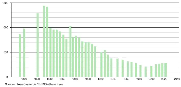 L'évolution du nombre d'habitants est connue à travers les recensements de la population effectués dans la commune depuis 1793. Pour les communes de moins de 10 000 habitants, une enquête de recensement portant sur toute la population est réalisée tous les cinq ans, les populations de référence des années intermédiaires étant quant à elles estimées par interpolation ou extrapolation[14]. Pour la commune, le premier recensement exhaustif entrant dans le cadre du nouveau dispositif a été réalisé en 2006[15].
