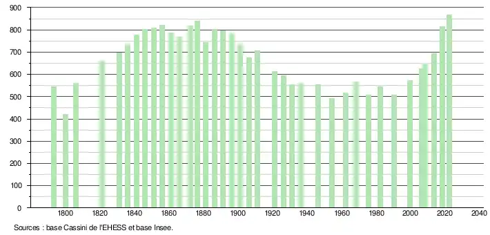 L'évolution du nombre d'habitants est connue à travers les recensements de la population effectués dans la commune depuis 1793. Pour les communes de moins de 10 000 habitants, une enquête de recensement portant sur toute la population est réalisée tous les cinq ans, les populations de référence des années intermédiaires étant quant à elles estimées par interpolation ou extrapolation[17]. Pour la commune, le premier recensement exhaustif entrant dans le cadre du nouveau dispositif a été réalisé en 2008[18].