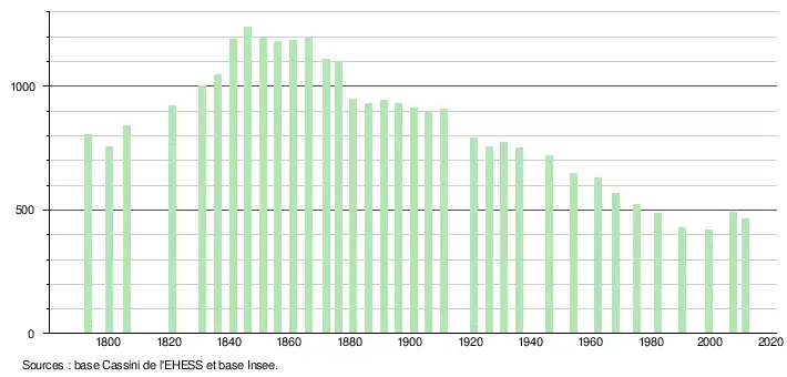 L'évolution du nombre d'habitants est connue à travers les recensements de la population effectués dans la commune depuis 1793. À partir du , les populations légales des communes sont publiées annuellement dans le cadre d'un recensement qui repose désormais sur une collecte d'information annuelle, concernant successivement tous les territoires communaux au cours d'une période de cinq ans. Pour les communes de moins de 10 000 habitants, une enquête de recensement portant sur toute la population est réalisée tous les cinq ans, les populations légales des années intermédiaires étant quant à elles estimées par interpolation ou extrapolation[11]. Pour la commune, le premier recensement exhaustif entrant dans le cadre du nouveau dispositif a été réalisé en 2007[12],[Note 2].