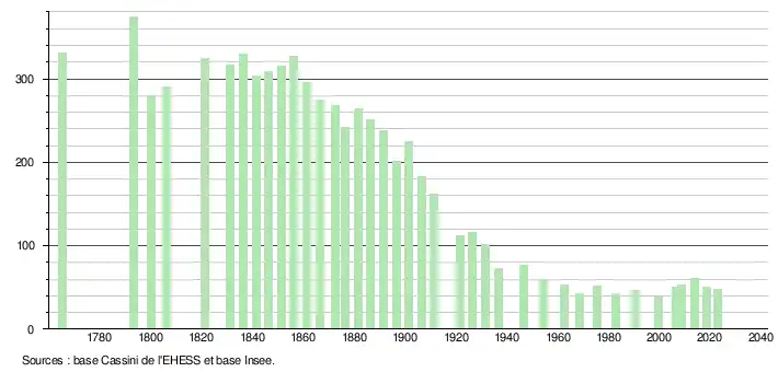 L'évolution du nombre d'habitants est connue à travers les recensements de la population effectués dans la commune depuis 1765. Pour les communes de moins de 10 000 habitants, une enquête de recensement portant sur toute la population est réalisée tous les cinq ans, les populations de référence des années intermédiaires étant quant à elles estimées par interpolation ou extrapolation[39]. Pour la commune, le premier recensement exhaustif entrant dans le cadre du nouveau dispositif a été réalisé en 2008[40].