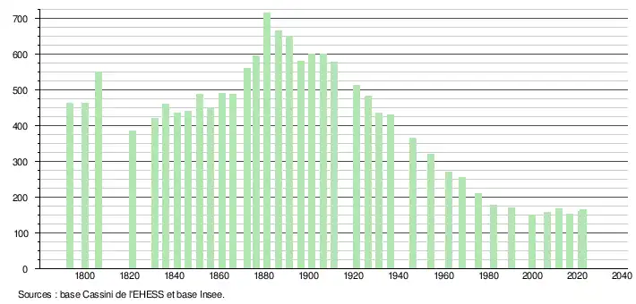 L'évolution du nombre d'habitants est connue à travers les recensements de la population effectués dans la commune depuis 1793. Pour les communes de moins de 10 000 habitants, une enquête de recensement portant sur toute la population est réalisée tous les cinq ans, les populations de référence des années intermédiaires étant quant à elles estimées par interpolation ou extrapolation[22]. Pour la commune, le premier recensement exhaustif entrant dans le cadre du nouveau dispositif a été réalisé en 2006[23].
