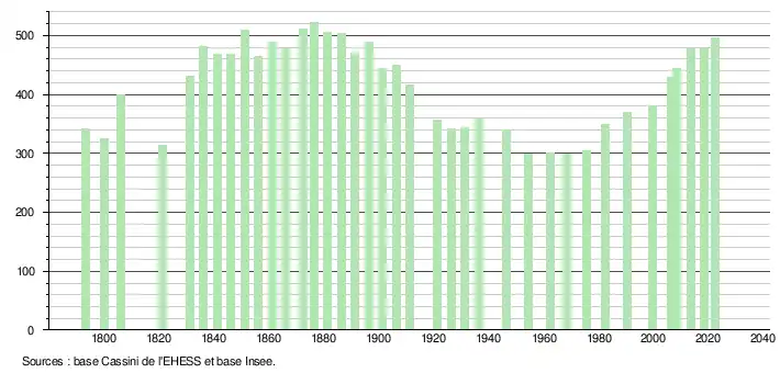 L'évolution du nombre d'habitants est connue à travers les recensements de la population effectués dans la commune depuis 1793. Pour les communes de moins de 10 000 habitants, une enquête de recensement portant sur toute la population est réalisée tous les cinq ans, les populations de référence des années intermédiaires étant quant à elles estimées par interpolation ou extrapolation[22]. Pour la commune, le premier recensement exhaustif entrant dans le cadre du nouveau dispositif a été réalisé en 2008[23].