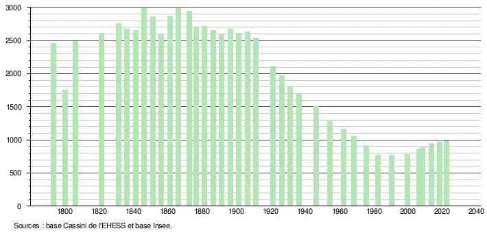 L'évolution du nombre d'habitants est connue à travers les recensements de la population effectués dans la commune depuis 1793. Pour les communes de moins de 10 000 habitants, une enquête de recensement portant sur toute la population est réalisée tous les cinq ans, les populations de référence des années intermédiaires étant quant à elles estimées par interpolation ou extrapolation[22]. Pour la commune, le premier recensement exhaustif entrant dans le cadre du nouveau dispositif a été réalisé en 2008[23].