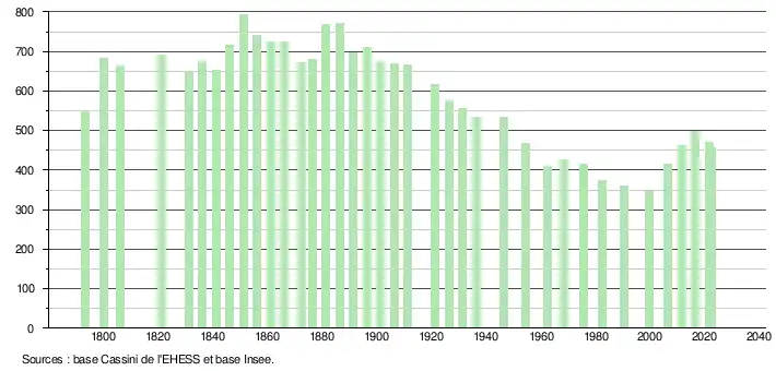 L'évolution du nombre d'habitants est connue à travers les recensements de la population effectués dans la commune depuis 1793. Pour les communes de moins de 10 000 habitants, une enquête de recensement portant sur toute la population est réalisée tous les cinq ans, les populations de référence des années intermédiaires étant quant à elles estimées par interpolation ou extrapolation[21]. Pour la commune, le premier recensement exhaustif entrant dans le cadre du nouveau dispositif a été réalisé en 2006[22].