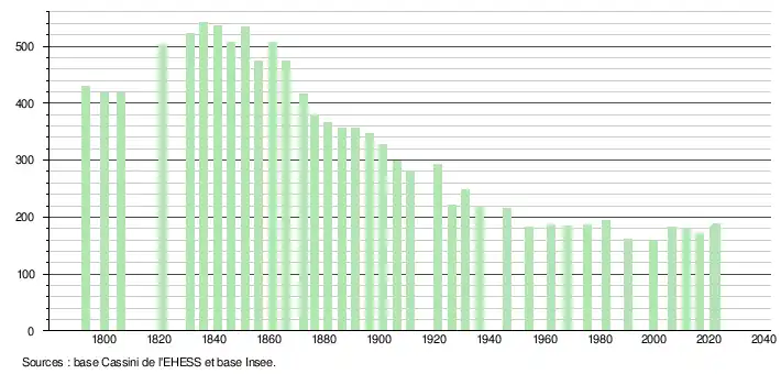 Au recensement de 1688, la commune comprenait 26 feux (foyers) totalisant 167 habitants et 90 feux (431 habitants) en 1789[38].