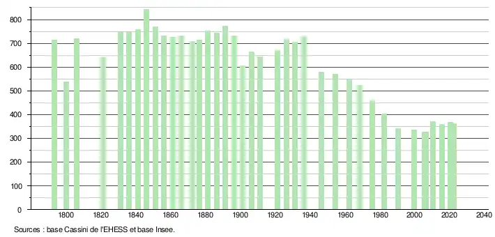 L'évolution du nombre d'habitants est connue à travers les recensements de la population effectués dans la commune depuis 1793. Pour les communes de moins de 10 000 habitants, une enquête de recensement portant sur toute la population est réalisée tous les cinq ans, les populations de référence des années intermédiaires étant quant à elles estimées par interpolation ou extrapolation[25]. Pour la commune, le premier recensement exhaustif entrant dans le cadre du nouveau dispositif a été réalisé en 2005[26].