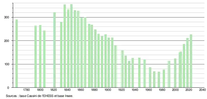 L'évolution du nombre d'habitants est connue à travers les recensements de la population effectués dans la commune depuis 1765. Pour les communes de moins de 10 000 habitants, une enquête de recensement portant sur toute la population est réalisée tous les cinq ans, les populations de référence des années intermédiaires étant quant à elles estimées par interpolation ou extrapolation[34]. Pour la commune, le premier recensement exhaustif entrant dans le cadre du nouveau dispositif a été réalisé en 2007[35].