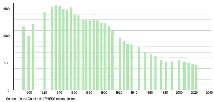 L'évolution du nombre d'habitants est connue à travers les recensements de la population effectués dans la commune depuis 1793. Pour les communes de moins de 10 000 habitants, une enquête de recensement portant sur toute la population est réalisée tous les cinq ans, les populations de référence des années intermédiaires étant quant à elles estimées par interpolation ou extrapolation[15]. Pour la commune, le premier recensement exhaustif entrant dans le cadre du nouveau dispositif a été réalisé en 2007[16].