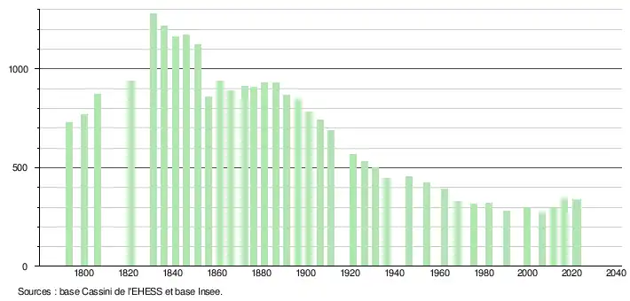 L'évolution du nombre d'habitants est connue à travers les recensements de la population effectués dans la commune depuis 1793. Pour les communes de moins de 10 000 habitants, une enquête de recensement portant sur toute la population est réalisée tous les cinq ans, les populations de référence des années intermédiaires étant quant à elles estimées par interpolation ou extrapolation[14]. Pour la commune, le premier recensement exhaustif entrant dans le cadre du nouveau dispositif a été réalisé en 2006[15].