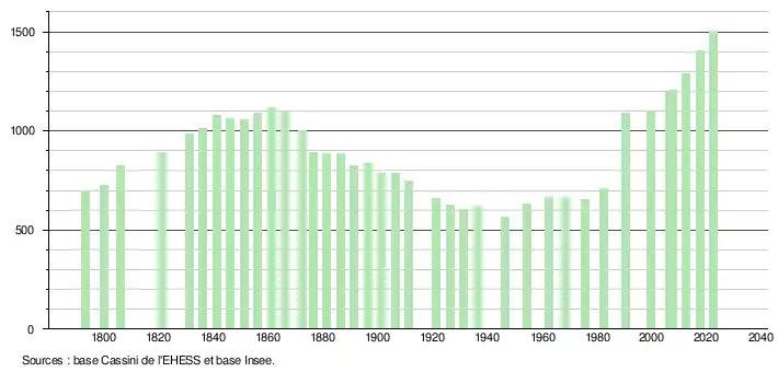 L'évolution du nombre d'habitants est connue à travers les recensements de la population effectués dans la commune depuis 1793. Pour les communes de moins de 10 000 habitants, une enquête de recensement portant sur toute la population est réalisée tous les cinq ans, les populations de référence des années intermédiaires étant quant à elles estimées par interpolation ou extrapolation[33]. Pour la commune, le premier recensement exhaustif entrant dans le cadre du nouveau dispositif a été réalisé en 2007[34].