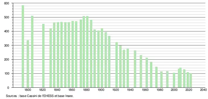 L'évolution du nombre d'habitants est connue à travers les recensements de la population effectués dans la commune depuis 1793. Pour les communes de moins de 10 000 habitants, une enquête de recensement portant sur toute la population est réalisée tous les cinq ans, les populations de référence des années intermédiaires étant quant à elles estimées par interpolation ou extrapolation[14]. Pour la commune, le premier recensement exhaustif entrant dans le cadre du nouveau dispositif a été réalisé en 2008[15].
