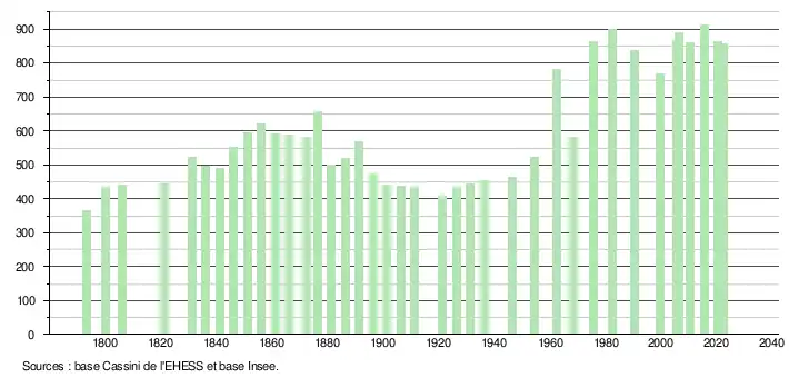L'évolution du nombre d'habitants est connue à travers les recensements de la population effectués dans la commune depuis 1793. Pour les communes de moins de 10 000 habitants, une enquête de recensement portant sur toute la population est réalisée tous les cinq ans, les populations de référence des années intermédiaires étant quant à elles estimées par interpolation ou extrapolation[14]. Pour la commune, le premier recensement exhaustif entrant dans le cadre du nouveau dispositif a été réalisé en 2005[15].