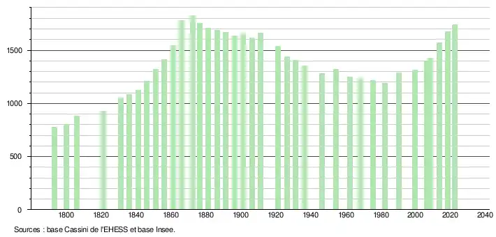 | L'évolution du nombre d'habitants est connue à travers les recensements de la population effectués dans la commune depuis 1793. Pour les communes de moins de 10 000 habitants, une enquête de recensement portant sur toute la population est réalisée tous les cinq ans, les populations de référence des années intermédiaires étant quant à elles estimées par interpolation ou extrapolation[26]. Pour la commune, le premier recensement exhaustif entrant dans le cadre du nouveau dispositif a été réalisé en 2008[27]. En 2022, la commune comptait 1 738 habitants[Note 1], en évolution de +7,68 % par rapport à 2016 (Landes : +5,78 %, France hors Mayotte : +2,11 %). |