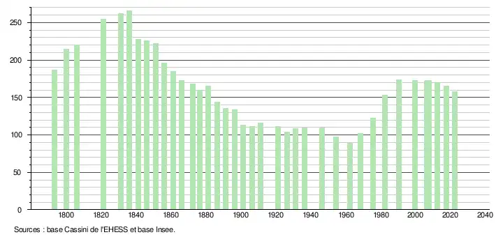 L'évolution du nombre d'habitants est connue à travers les recensements de la population effectués dans la commune depuis 1793. Pour les communes de moins de 10 000 habitants, une enquête de recensement portant sur toute la population est réalisée tous les cinq ans, les populations de référence des années intermédiaires étant quant à elles estimées par interpolation ou extrapolation[16]. Pour la commune, le premier recensement exhaustif entrant dans le cadre du nouveau dispositif a été réalisé en 2007[17].