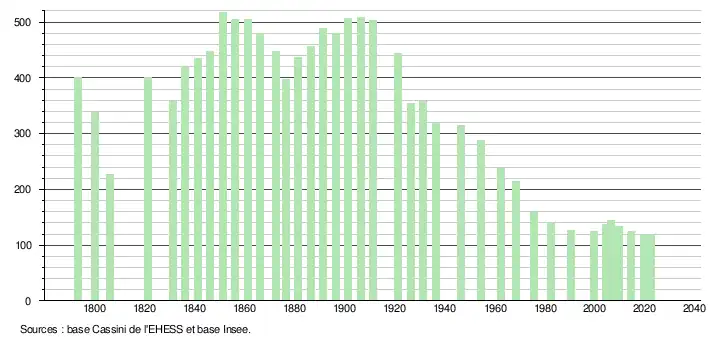 L'évolution du nombre d'habitants est connue à travers les recensements de la population effectués dans la commune depuis 1793. Pour les communes de moins de 10 000 habitants, une enquête de recensement portant sur toute la population est réalisée tous les cinq ans, les populations de référence des années intermédiaires étant quant à elles estimées par interpolation ou extrapolation[22]. Pour la commune, le premier recensement exhaustif entrant dans le cadre du nouveau dispositif a été réalisé en 2004[23].