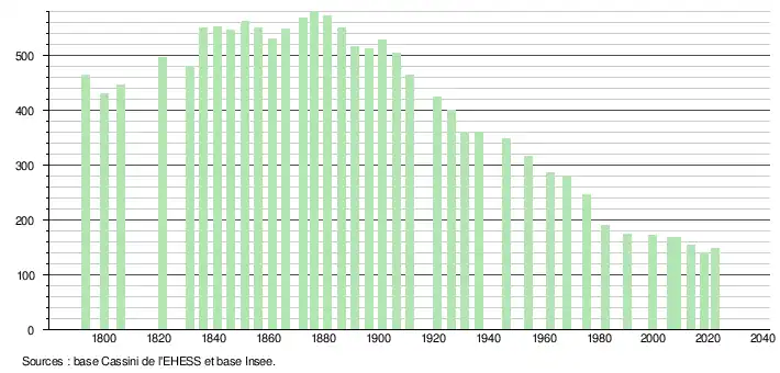 L'évolution du nombre d'habitants est connue à travers les recensements de la population effectués dans la commune depuis 1793. Pour les communes de moins de 10 000 habitants, une enquête de recensement portant sur toute la population est réalisée tous les cinq ans, les populations de référence des années intermédiaires étant quant à elles estimées par interpolation ou extrapolation[32]. Pour la commune, le premier recensement exhaustif entrant dans le cadre du nouveau dispositif a été réalisé en 2008[33].