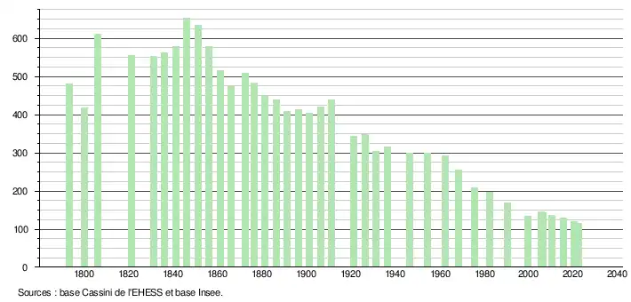 L'évolution du nombre d'habitants est connue à travers les recensements de la population effectués dans la commune depuis 1793. Pour les communes de moins de 10 000 habitants, une enquête de recensement portant sur toute la population est réalisée tous les cinq ans, les populations de référence des années intermédiaires étant quant à elles estimées par interpolation ou extrapolation[22]. Pour la commune, le premier recensement exhaustif entrant dans le cadre du nouveau dispositif a été réalisé en 2005[23].