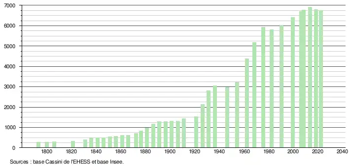 L'évolution du nombre d'habitants est connue à travers les recensements de la population effectués dans la commune depuis 1793. Pour les communes de moins de 10 000 habitants, une enquête de recensement portant sur toute la population est réalisée tous les cinq ans, les populations de référence des années intermédiaires étant quant à elles estimées par interpolation ou extrapolation[25]. Pour la commune, le premier recensement exhaustif entrant dans le cadre du nouveau dispositif a été réalisé en 2008[26].