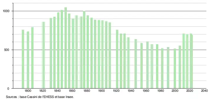 L'évolution du nombre d'habitants est connue à travers les recensements de la population effectués dans la commune depuis 1793. Pour les communes de moins de 10 000 habitants, une enquête de recensement portant sur toute la population est réalisée tous les cinq ans, les populations de référence des années intermédiaires étant quant à elles estimées par interpolation ou extrapolation[14]. Pour la commune, le premier recensement exhaustif entrant dans le cadre du nouveau dispositif a été réalisé en 2006[15].