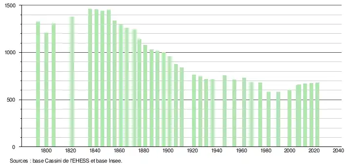L'évolution du nombre d'habitants est connue à travers les recensements de la population effectués dans la commune depuis 1793. Pour les communes de moins de 10 000 habitants, une enquête de recensement portant sur toute la population est réalisée tous les cinq ans, les populations de référence des années intermédiaires étant quant à elles estimées par interpolation ou extrapolation[20]. Pour la commune, le premier recensement exhaustif entrant dans le cadre du nouveau dispositif a été réalisé en 2007[21].