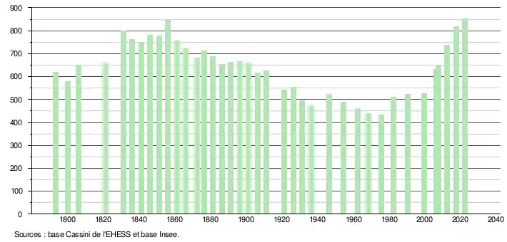 L'évolution du nombre d'habitants est connue à travers les recensements de la population effectués dans la commune depuis 1793. Pour les communes de moins de 10 000 habitants, une enquête de recensement portant sur toute la population est réalisée tous les cinq ans, les populations de référence des années intermédiaires étant quant à elles estimées par interpolation ou extrapolation[16]. Pour la commune, le premier recensement exhaustif entrant dans le cadre du nouveau dispositif a été réalisé en 2007[17].
