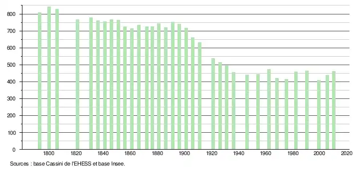 - ↑ Par convention dans Wikipédia, le principe a été retenu de n’afficher dans le tableau des recensements et le graphique, pour les populations légales postérieures à 1999, que les populations correspondant à une enquête exhaustive de recensement pour les communes de moins de 10 000 habitants, et que les populations des années 2006, 2011, 2016, etc. pour les communes de plus de 10 000 habitants, ainsi que la dernière population légale publiée par l’Insee pour l'ensemble des communes.