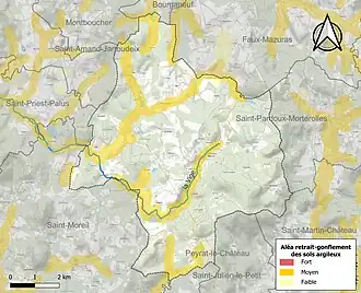 Le retrait-gonflement des sols argileux est susceptible d'engendrer des dommages importants aux bâtiments en cas d’alternance de périodes de sécheresse et de pluie. 19,5 % de la superficie communale est en aléa moyen ou fort (33,6 % au niveau départemental et 48,5 % au niveau national). Sur les 166 bâtiments dénombrés sur la commune en 2019, 21 sont en aléa moyen ou fort, soit 13 %, à comparer aux 25 % au niveau départemental et 54 % au niveau national. Une cartographie de l'exposition du territoire national au retrait gonflement des sols argileux est disponible sur le site du BRGM[16],[Carte 2].
