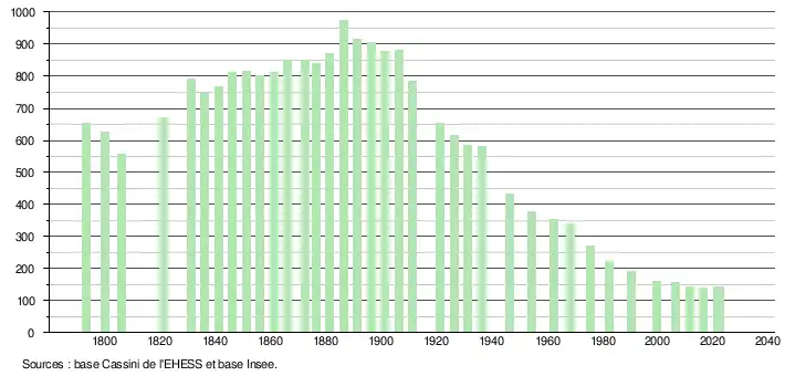 L'évolution du nombre d'habitants est connue à travers les recensements de la population effectués dans la commune depuis 1793. Pour les communes de moins de 10 000 habitants, une enquête de recensement portant sur toute la population est réalisée tous les cinq ans, les populations de référence des années intermédiaires étant quant à elles estimées par interpolation ou extrapolation[19]. Pour la commune, le premier recensement exhaustif entrant dans le cadre du nouveau dispositif a été réalisé en 2006[20].