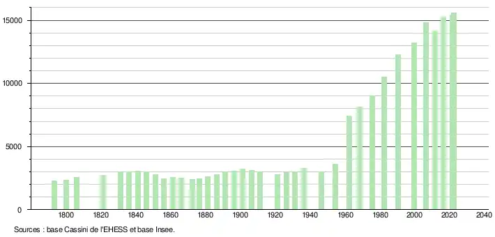 L'évolution du nombre d'habitants est connue à travers les recensements de la population effectués dans la commune depuis 1793. Pour les communes de plus de 10 000 habitants les recensements ont lieu chaque année à la suite d'une enquête par sondage auprès d'un échantillon d'adresses représentant 8 % de leurs logements, contrairement aux autres communes qui ont un recensement réel tous les cinq ans[21],[Note 5].