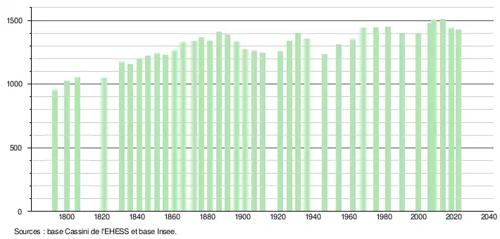L'évolution du nombre d'habitants est connue à travers les recensements de la population effectués dans la commune depuis 1793. Pour les communes de moins de 10 000 habitants, une enquête de recensement portant sur toute la population est réalisée tous les cinq ans, les populations de référence des années intermédiaires étant quant à elles estimées par interpolation ou extrapolation[25]. Pour la commune, le premier recensement exhaustif entrant dans le cadre du nouveau dispositif a été réalisé en 2008[26].
