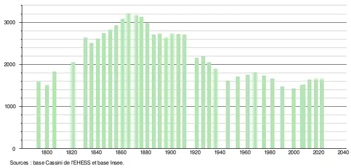 L'évolution du nombre d'habitants est connue à travers les recensements de la population effectués dans la commune depuis 1793. Pour les communes de moins de 10 000 habitants, une enquête de recensement portant sur toute la population est réalisée tous les cinq ans, les populations de référence des années intermédiaires étant quant à elles estimées par interpolation ou extrapolation[16]. Pour la commune, le premier recensement exhaustif entrant dans le cadre du nouveau dispositif a été réalisé en 2007[17].