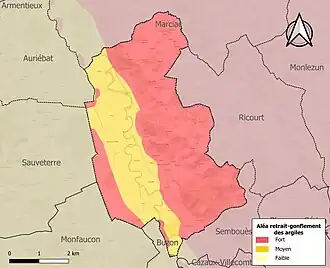 Le retrait-gonflement des sols argileux est susceptible d'engendrer des dommages importants aux bâtiments en cas d’alternance de périodes de sécheresse et de pluie. La totalité de la commune est en aléa moyen ou fort (94,5 % au niveau départemental et 48,5 % au niveau national). Sur les 99 bâtiments dénombrés sur la commune en 2019, 99 sont en aléa moyen ou fort, soit 100 %, à comparer aux 93 % au niveau départemental et 54 % au niveau national. Une cartographie de l'exposition du territoire national au retrait gonflement des sols argileux est disponible sur le site du BRGM[19],[Carte 3].