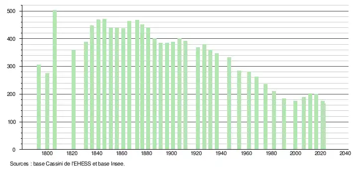 L'évolution du nombre d'habitants est connue à travers les recensements de la population effectués dans la commune depuis 1793. Pour les communes de moins de 10 000 habitants, une enquête de recensement portant sur toute la population est réalisée tous les cinq ans, les populations de référence des années intermédiaires étant quant à elles estimées par interpolation ou extrapolation[32]. Pour la commune, le premier recensement exhaustif entrant dans le cadre du nouveau dispositif a été réalisé en 2006[33].