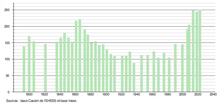 L'évolution du nombre d'habitants est connue à travers les recensements de la population effectués dans la commune depuis 1793. Pour les communes de moins de 10 000 habitants, une enquête de recensement portant sur toute la population est réalisée tous les cinq ans, les populations de référence des années intermédiaires étant quant à elles estimées par interpolation ou extrapolation[18]. Pour la commune, le premier recensement exhaustif entrant dans le cadre du nouveau dispositif a été réalisé en 2008[19].