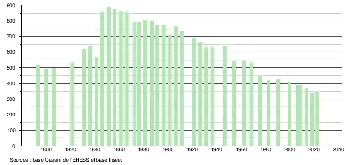 L'évolution du nombre d'habitants est connue à travers les recensements de la population effectués dans la commune depuis 1793. Pour les communes de moins de 10 000 habitants, une enquête de recensement portant sur toute la population est réalisée tous les cinq ans, les populations de référence des années intermédiaires étant quant à elles estimées par interpolation ou extrapolation[25]. Pour la commune, le premier recensement exhaustif entrant dans le cadre du nouveau dispositif a été réalisé en 2008[26].