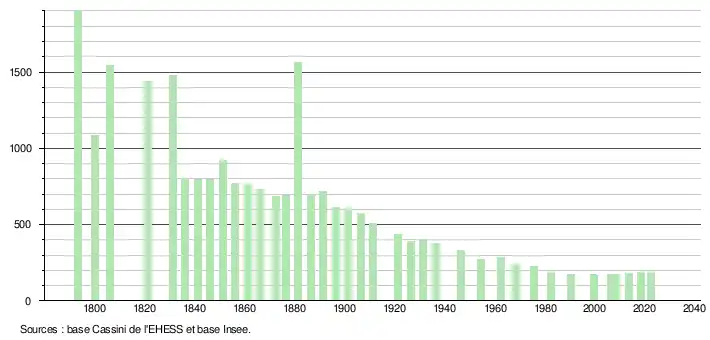 L'évolution du nombre d'habitants est connue à travers les recensements de la population effectués dans la commune depuis 1793. Pour les communes de moins de 10 000 habitants, une enquête de recensement portant sur toute la population est réalisée tous les cinq ans, les populations de référence des années intermédiaires étant quant à elles estimées par interpolation ou extrapolation[29]. Pour la commune, le premier recensement exhaustif entrant dans le cadre du nouveau dispositif a été réalisé en 2008[30].